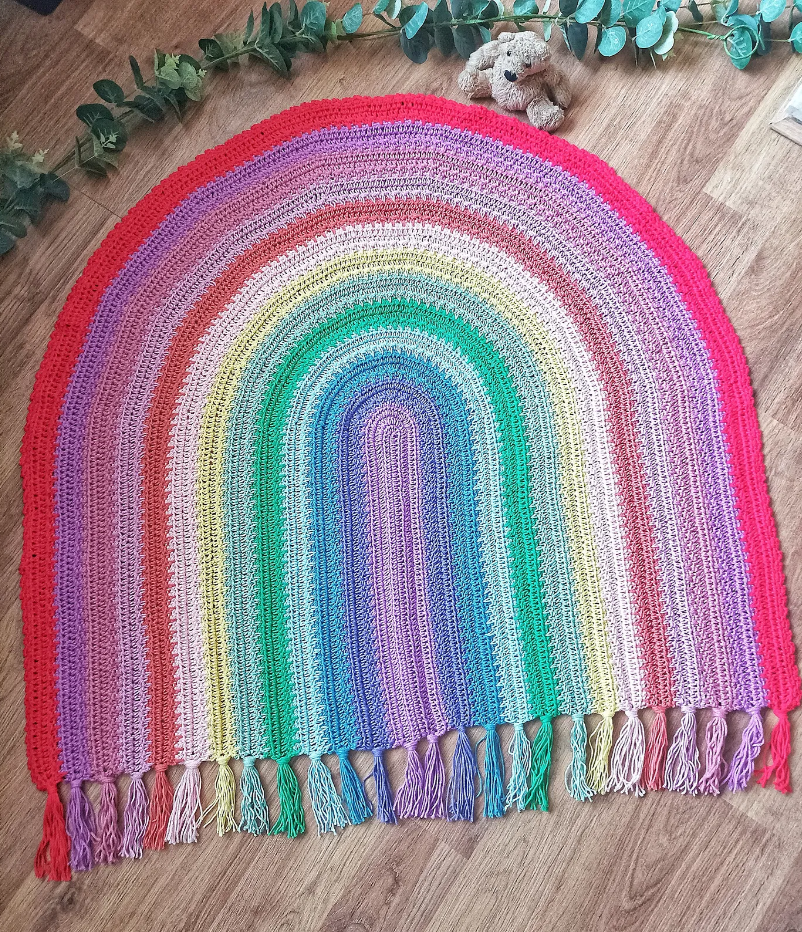 This rainbow blanket works up fairly quick! I used cotton dk yarn, but any yarn can be used even aran weight 4, but the size will differ. It can be made in lots of other different colour combinations than what I used.